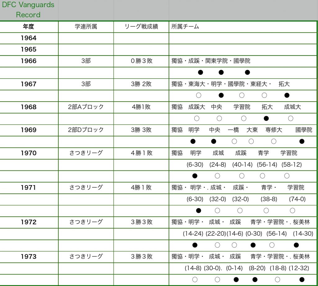 1973年、関東学生アメリカンフットボール連盟は、並列リーグとなって4年目のシーズンを迎えた。 この年、関東学生リーグはローズリーグに改称。DUAFCは引き続き「さつきリーグ」で青学・成蹊・明学・桜美林・成城・学習院・獨協の7チームによるリーグ展開をした。 73シーズンは長年「打倒」明学を標榜してきたDUAFCが初めて勝利することができたシーズンであったが、3勝3敗で4位に終わりました。 (DUAFC創部60周年記念誌の`73記事より)